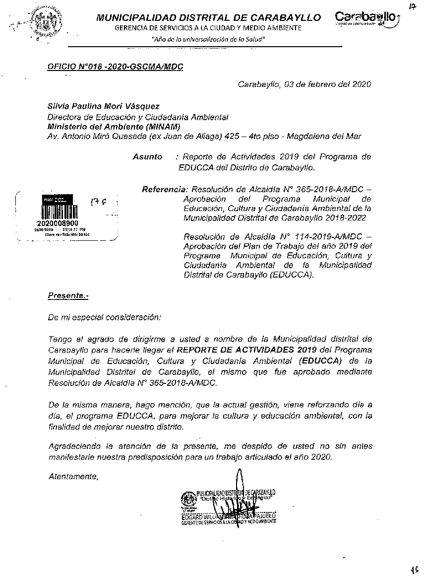 De acuerdo al instructivo para elaborar e implementar el Programa Municipal EDUCCA (Resolución Ministerial N°456- 2018- MINAM), la Municipalidad Distrital de Carabayllo, remite al MINAM las actividades desarrolladas durante el 2019 en el marco del Programa Municipal EDUCCA.