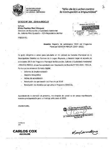 De acuerdo al instructivo para elaborar e implementar el Programa Municipal EDUCCA (Resolución Ministerial N°456- 2018- MINAM), la Municipalidad Distrital de Carmen de La Legua, remite al MINAM las actividades desarrolladas durante el 2019 en el marco del Programa Municipal EDUCCA.