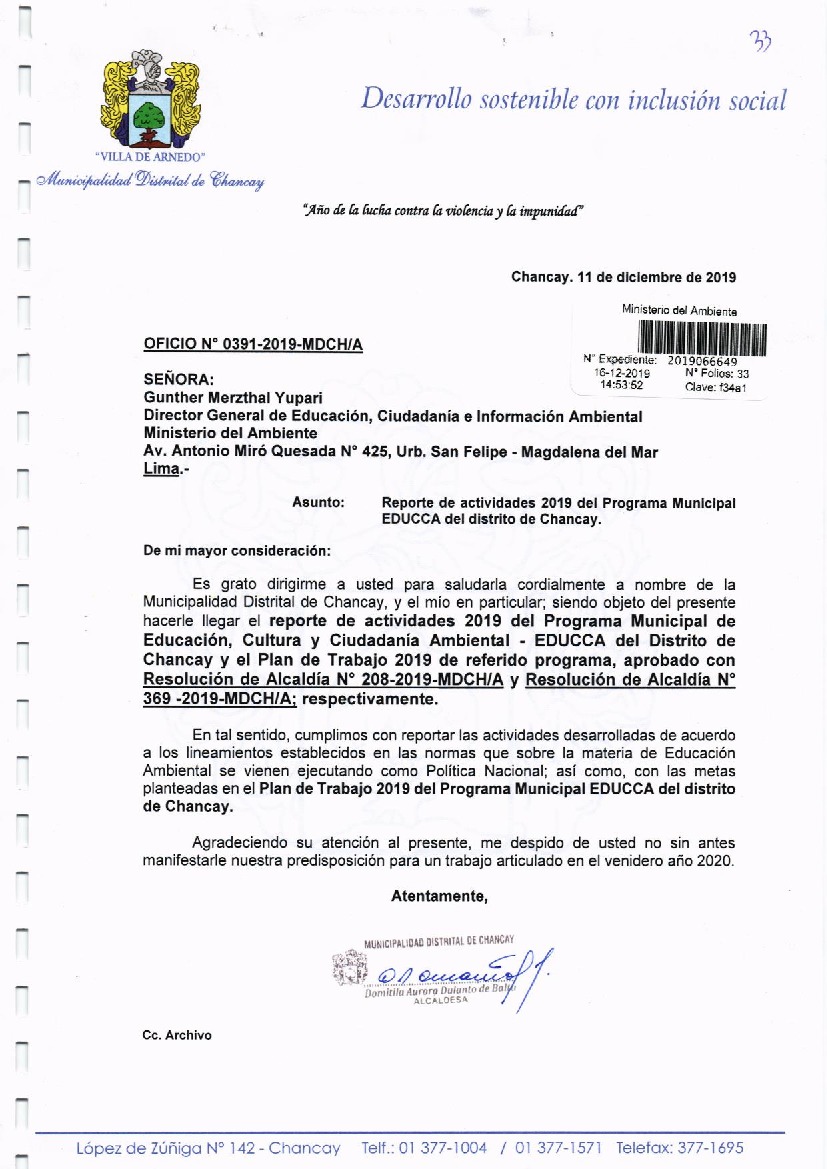 Y de acuerdo al instructivo para elaborar e implementar del Programa Municipal EDUCCA (Resolución Ministerial N°456- 2018- MINAM), la Municipalidad Distrital de Chancay- Huaral remite al MINAM las actividades desarrolladas el 2019 en el marco del Programa Municipal EDUCCA- Chancay- Huaral aprobado con Resolución de Alcaldía N° 0208-2019-MDCH/A del 11 de abril del 2019, que actualiza el programa aprobado con Acuerdo de Concejo N° 089-2018-MDCH del 28 de agosto 2018