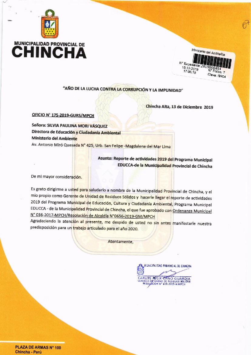 Y de acuerdo al instructivo para elaborar e implementar del Programa Municipal EDUCCA (Resolución Ministerial N°456- 2018- MINAM), la Municipalidad Provincial de Chincha- Ica remite al MINAM las actividades desarrolladas el 2019 en el marco del Programa Municipal EDUCCA- Chincha- Ica aprobado con Ordenanza N° 036-2017-MPCH del 13 de octubre 2017.
