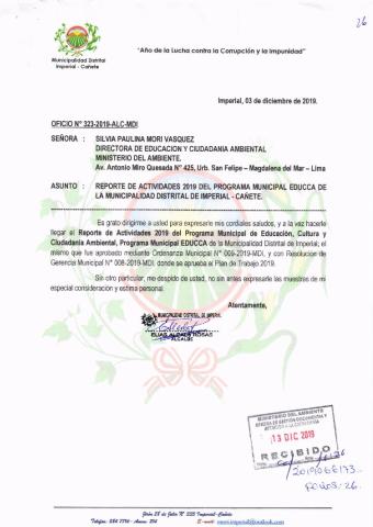 Y de acuerdo al instructivo para elaborar e implementar del Programa Municipal EDUCCA (Resolución Ministerial N°456- 2018- MINAM), la Municipalidad Distrital de Imperial- Cañete remite al MINAM las actividades desarrolladas el 2019 en el marco del Programa Municipal EDUCCA- Imperial- Cañete aprobado con Ordenanza Municipal N° 009-2019-MDI del 3 de julio de 2019, que actualiza el programa aprobado con Resolución de Alcaldía N° 165-2018-MDI del 26 de junio del 2018.
