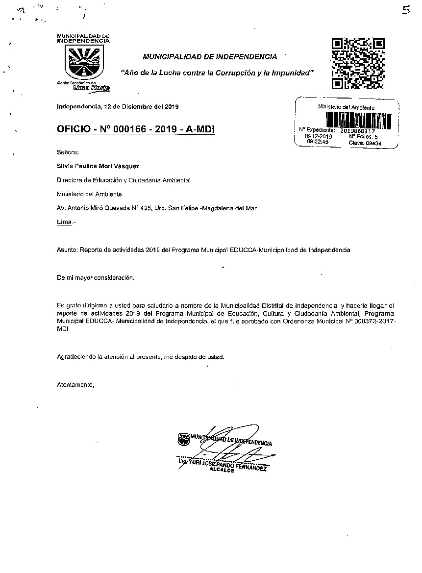 De acuerdo al instructivo para elaborar e implementar el Programa Municipal EDUCCA (Resolución Ministerial N°456- 2018- MINAM), la Municipalidad Distrital de Independencia, remite al MINAM las actividades desarrolladas durante el 2019 en el marco del Programa Municipal EDUCCA.