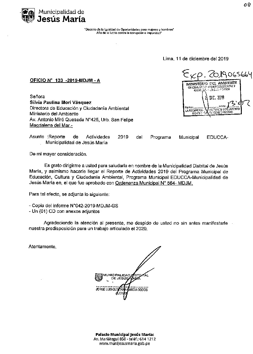De acuerdo al instructivo para elaborar e implementar el Programa Municipal EDUCCA (Resolución Ministerial N°456- 2018- MINAM), la Municipalidad Distrital de Jesús María, remite al MINAM las actividades desarrolladas durante el 2019 en el marco del Programa Municipal EDUCCA.