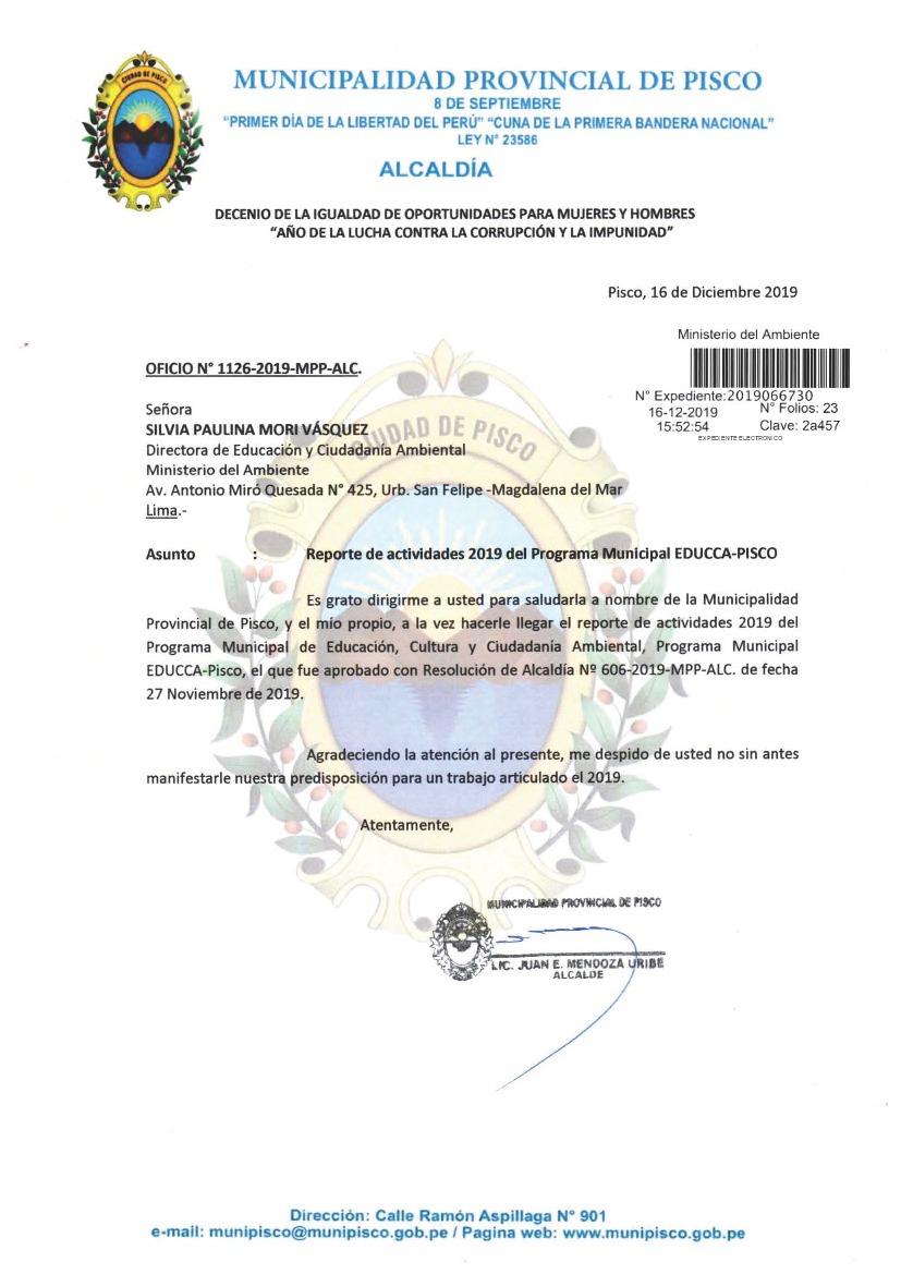 Y de acuerdo al instructivo para elaborar e implementar del Programa Municipal EDUCCA (Resolución Ministerial N°456- 2018- MINAM), la Municipalidad Provincial de Pisco- Ica. remite al MINAM las actividades desarrolladas el 2019 en el marco del Programa Municipal EDUCCA- Pisco, aprobado con Resolución de Alcaldía N° 144-2019-MDSA, del 13 de noviembre de 2019.