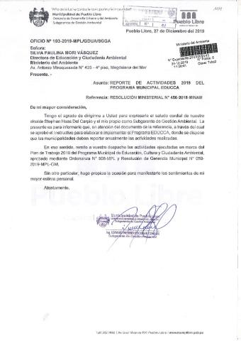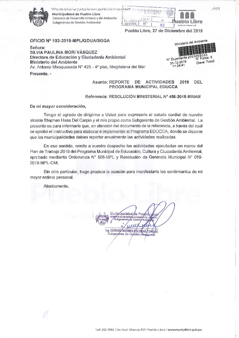 De acuerdo al instructivo para elaborar e implementar el Programa Municipal EDUCCA (Resolución Ministerial N°456- 2018- MINAM), la Municipalidad Distrital de Pueblo Libre, remite al MINAM las actividades desarrolladas durante el 2019 en el marco del Programa Municipal EDUCCA.