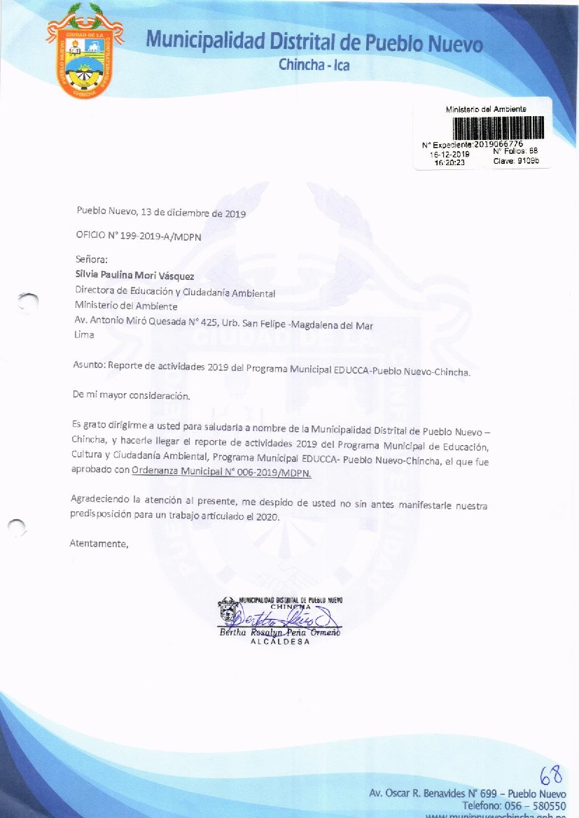 Y de acuerdo al instructivo para elaborar e implementar del Programa Municipal EDUCCA (Resolución Ministerial N°456- 2018- MINAM), la Municipalidad Distrital de Municipalidad Distrital de Pueblo Nuevo- Chincha remite al MINAM las actividades desarrolladas el 2019 en el marco del Programa Municipal EDUCCA- Pueblo Nuevo- Chincha aprobado con Ordenanza Municipal N°006-2019-MDPN del 28 de febrero del 2019.