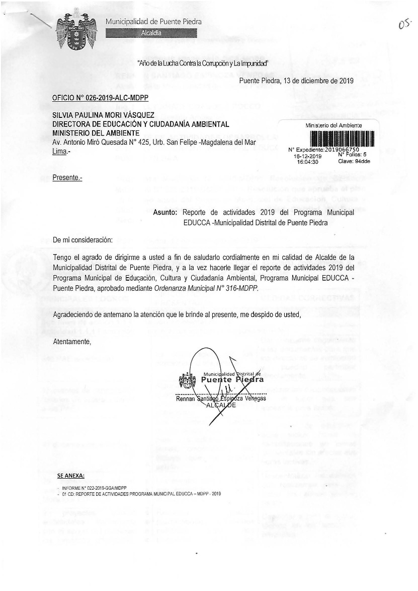 De acuerdo al instructivo para elaborar e implementar el Programa Municipal EDUCCA (Resolución Ministerial N°456- 2018- MINAM), la Municipalidad Distrital de Puente Piedra, remite al MINAM las actividades desarrolladas durante el 2019 en el marco del Programa Municipal EDUCCA