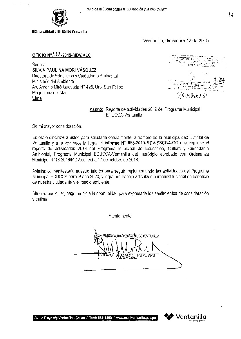 De acuerdo al instructivo para elaborar e implementar el Programa Municipal EDUCCA (Resolución Ministerial N°456- 2018- MINAM), la Municipalidad Distrital de Ventanilla, remite al MINAM las actividades desarrolladas durante el 2019 en el marco del Programa Municipal EDUCCA.