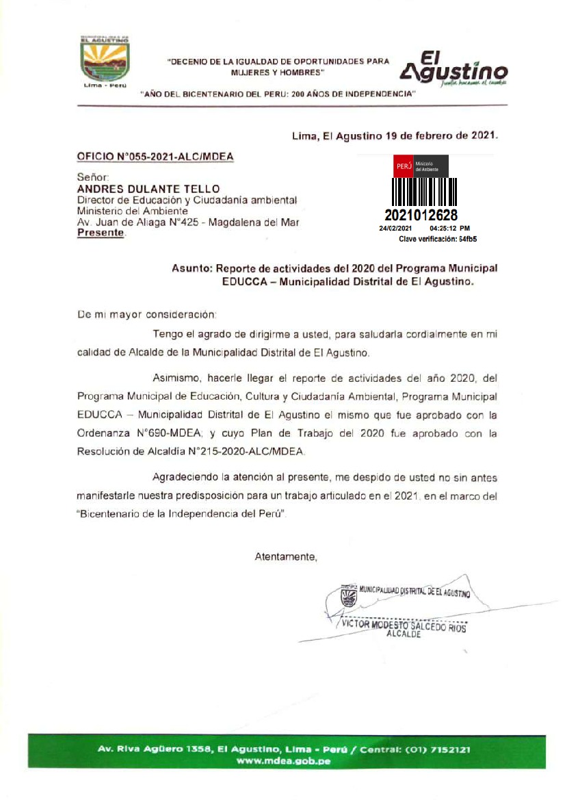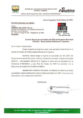 De acuerdo al instructivo para elaborar e implementar el Programa Municipal EDUCCA (Resolución Ministerial N°456- 2018- MINAM), la Municipalidad Distrital de El Agustino, remite al MINAM las actividades desarrolladas durante el 2020 en el marco del Programa Municipal EDUCCA.