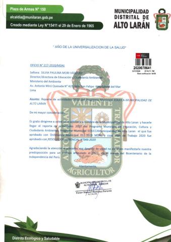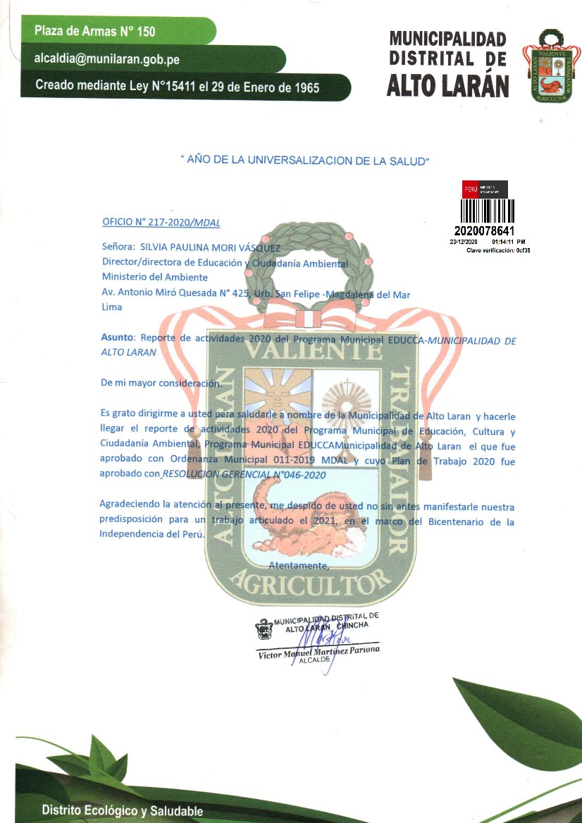 Y de acuerdo al instructivo para elaborar e implementar del Programa Municipal EDUCCA (Resolución Ministerial N°456-2018-MINAM), la Municipalidad Distrital de Alto Larán- Chincha- Ica, remite al MINAM las actividades desarrolladas el 2020 en el marco del Programa Municipal EDUCCA-Alto Larán.