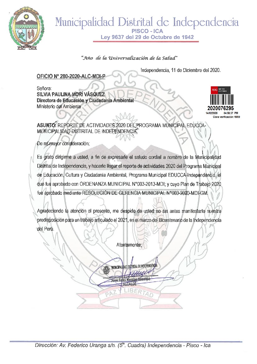 Y de acuerdo al instructivo para elaborar e implementar del Programa Municipal EDUCCA (Resolución Ministerial N°456-2018-MINAM), la Municipalidad Distrital de Independencia-Pisco-Ica, remite al MINAM las actividades desarrolladas el 2020 en el marco del Programa Municipal EDUCCA- Independencia.