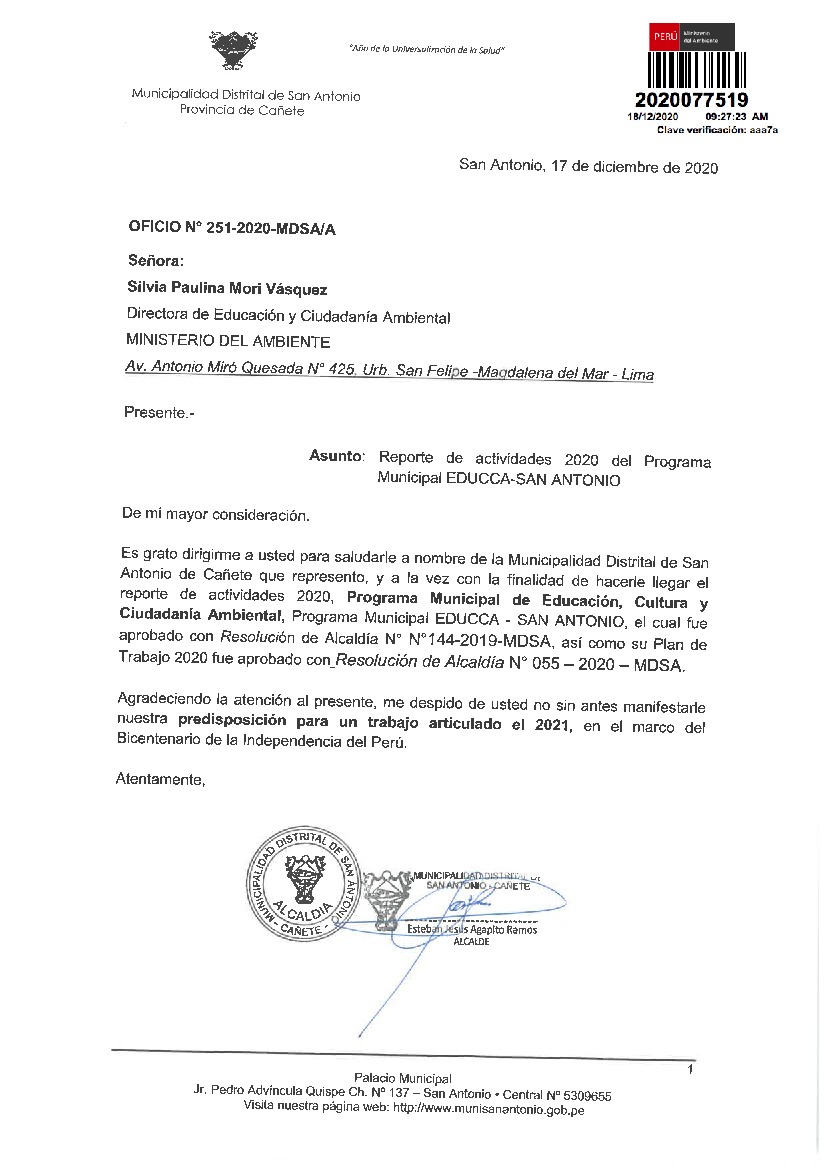 Y de acuerdo al instructivo para elaborar e implementar del Programa Municipal EDUCCA (Resolución Ministerial N°456-2018-MINAM), la Municipalidad Distrital de San Antonio-Cañete-Lima, remite al MINAM las actividades desarrolladas el 2020 en el marco del Programa Municipal EDUCCA-San Antonio.