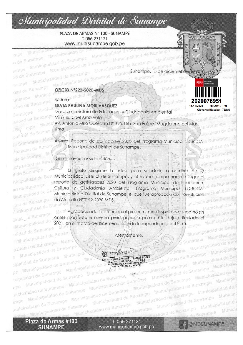 Y de acuerdo al instructivo para elaborar e implementar del Programa Municipal EDUCCA (Resolución Ministerial N°456-2018-MINAM), la Municipalidad Distrital de Sunampe-Chincha-Ica, remite al MINAM las actividades desarrolladas el 2020 en el marco del Programa Municipal EDUCCA-Sunampe.