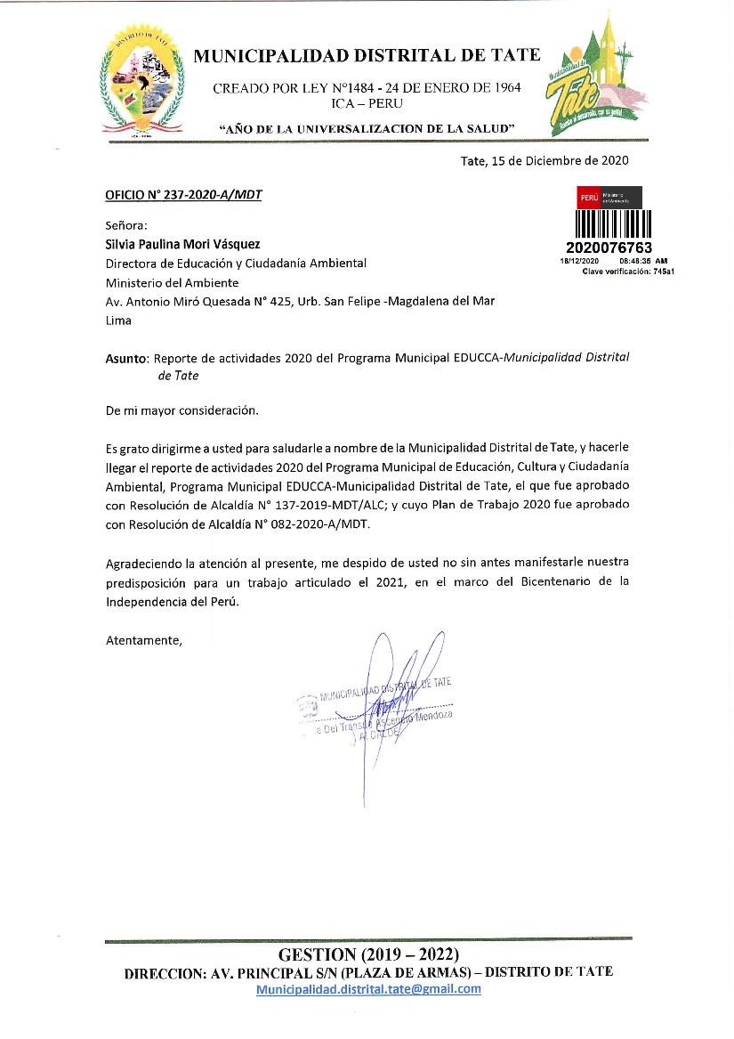 Y de acuerdo al instructivo para elaborar e implementar del Programa Municipal EDUCCA (Resolución Ministerial N°456-2018-MINAM), la Municipalidad Distrital de Tate-Ica-Ica, remite al MINAM las actividades desarrolladas el 2020 en el marco del Programa Municipal EDUCCA-Tate.