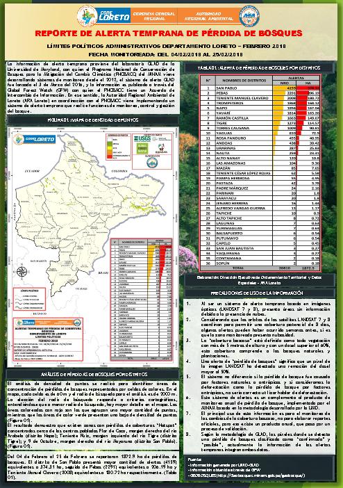 Reporte de alerta temprana de perdida de bosques en el departamento de Loreto - febrero 2018