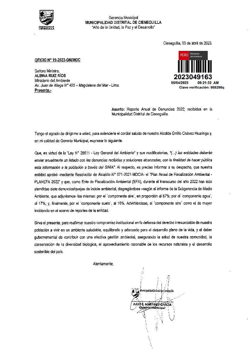 La entidad remite al Ministerio del Ambiente información sobre las denuncias ambientales en cumplimiento de lo establecido en el Decreto Legislativo N° 1055 que modifica el artículo 43° de la Ley N° 28611, que indica que "Las entidades deberán enviar anualmente un listado con las denuncias recibidas y soluciones alcanzadas, con la finalidad de hacer pública esta información a la población a través del SINIA".