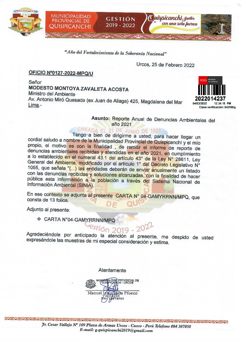 Reporte anual de denuncias ambientales del año 2021 de la Municipalidad Provincial de Quispicanchi