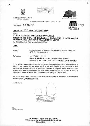 Reporte anual de denuncias ambientales del GORE JUNIN - Año 2020
