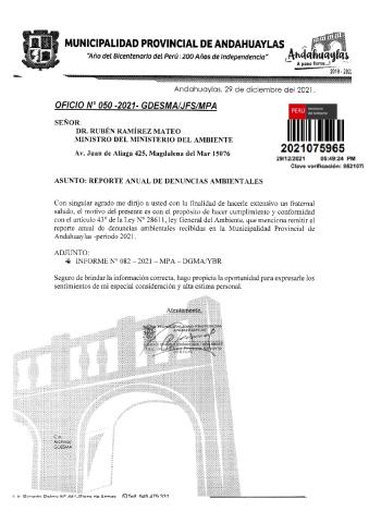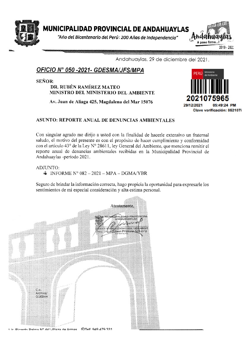 Reporte anual de denuncias ambientales de la municipalidad provincial de Andahauaylas - periodo 2021