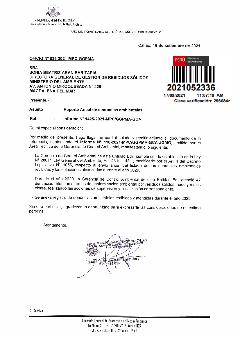 Reporte anual de denuncias ambientales del periodo 2020 de la Municipalidad Provincial del Callao