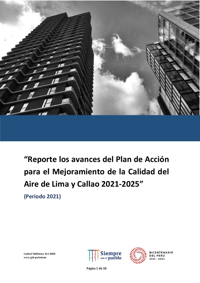 A través del presente informe, el MINAM da cuenta el proceso de seguimiento y reporte de los avances del Plan de Acción para el Mejoramiento de la Calidad del Aire de Lima y Callao al año 2021.
