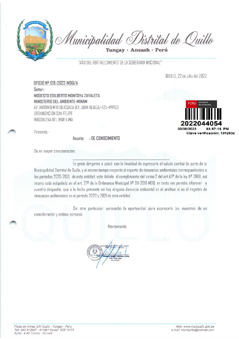 La entidad remite al Ministerio del Ambiente información sobre las denuncias ambientales en cumplimiento de lo establecido en el Decreto Legislativo N° 1055 que modifica el artículo 43° de la Ley N° 28611, que indica que "Las entidades deberán enviar anualmente un listado con las denuncias recibidas y soluciones alcanzadas, con la finalidad de hacer pública esta información a la población a través del SINIA".