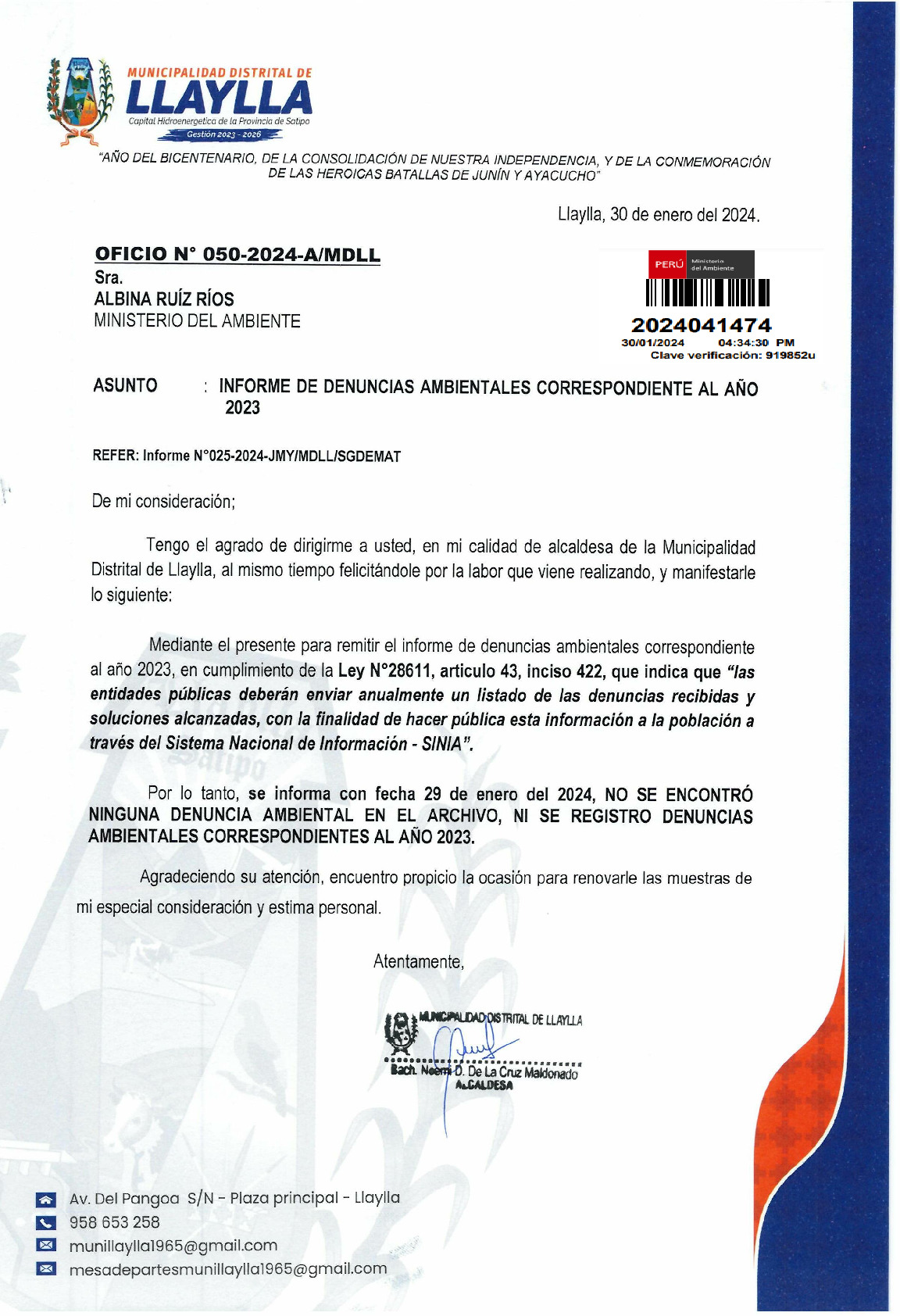Reporte de denuncias ambientales 2023 de la Municipalidad Distrital de Llaylla