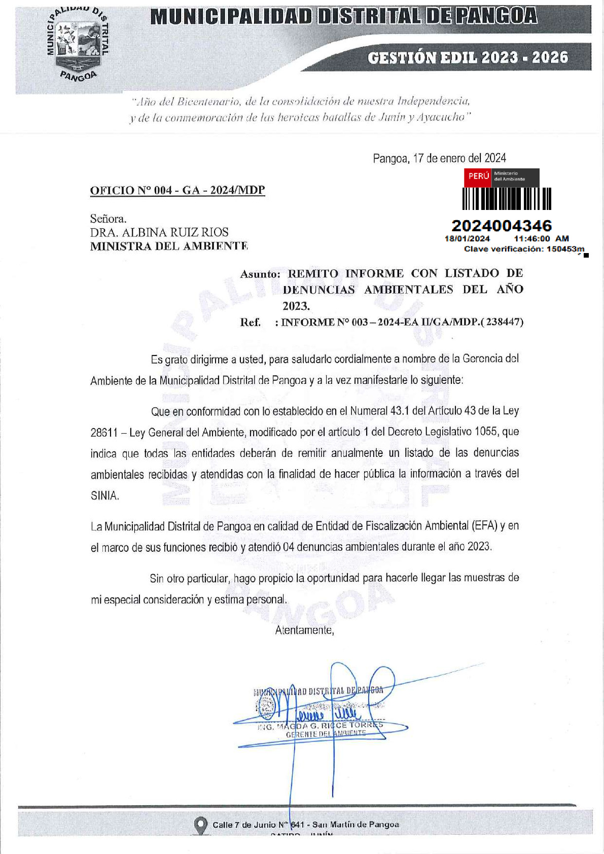 Reporte de denuncias ambientales 2023 de la Municipalidad Distrital de Pangoa