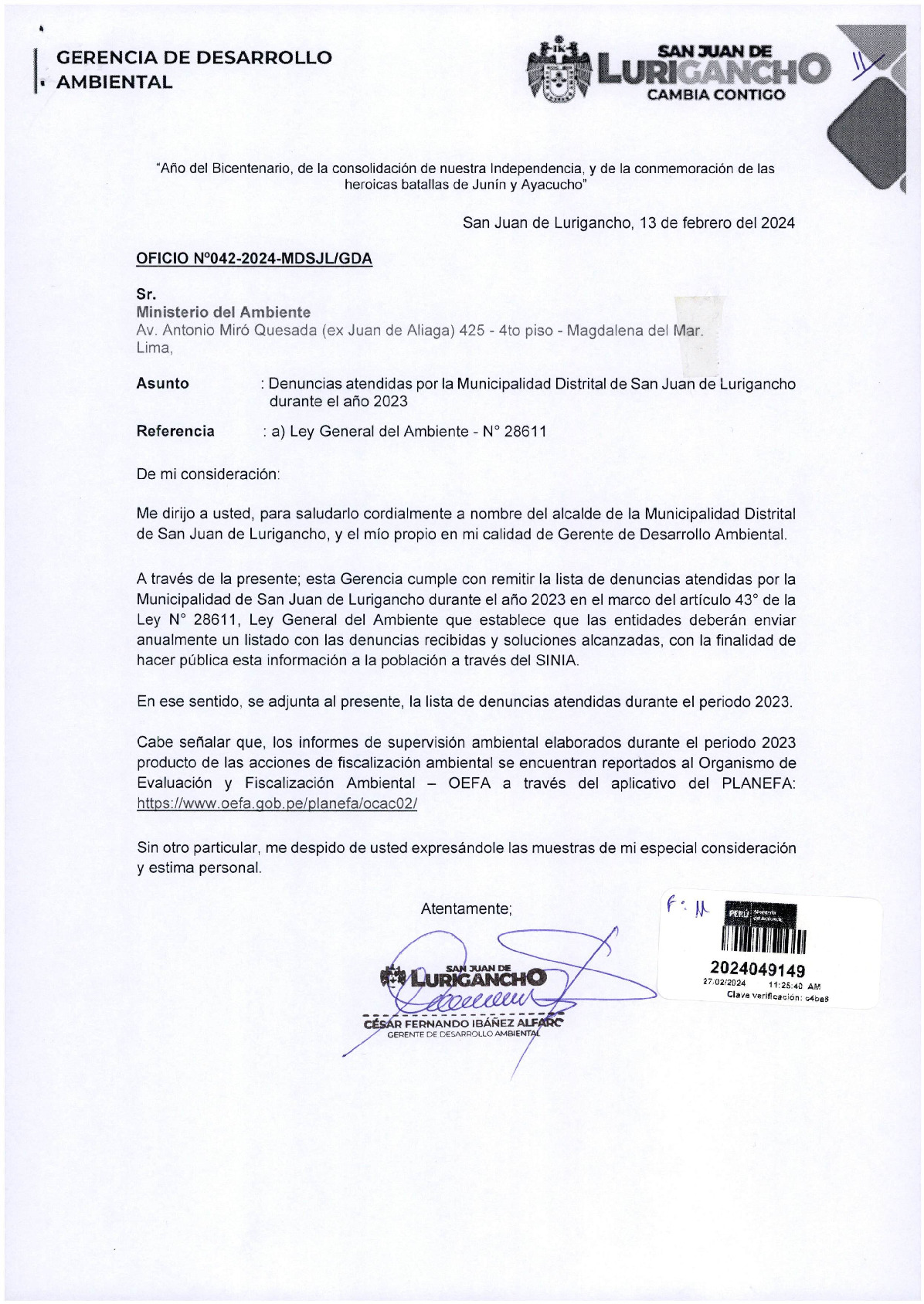 La entidad remite al Ministerio del Ambiente información sobre las denuncias ambientales en cumplimiento de lo establecido en el Decreto Legislativo N° 1055 que modifica el artículo 43° de la Ley N° 28611, que indica que "Las entidades deberán enviar anualmente un listado con las denuncias recibidas y soluciones alcanzadas, con la finalidad de hacer pública esta información a lav población a través del SINIA".