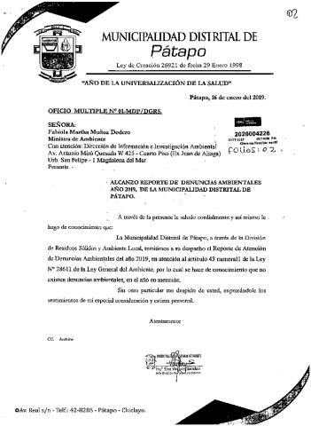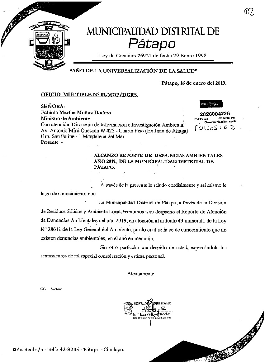 REPORTE DE DENUNCIAS AMBIENTALES AÑO 2019, DE LA MUNICIPALIDAD DISTRITAL DE PATAPO.