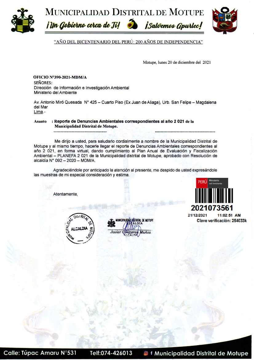 Reporte de denuncias ambientales correspondientes al año 2021 del Municipalidad Distrital de Motupe