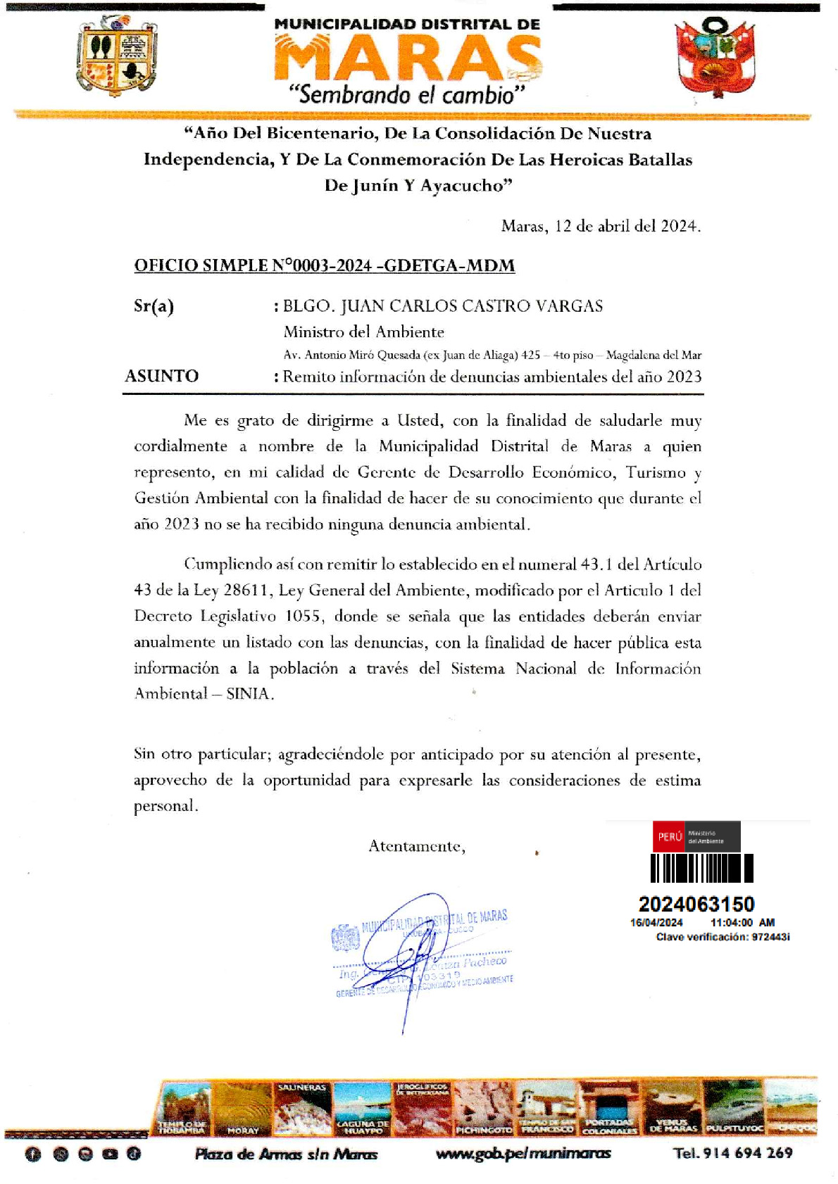 Reporte de denuncias ambientales presentados en la municipalidad distrital de Maras 2023