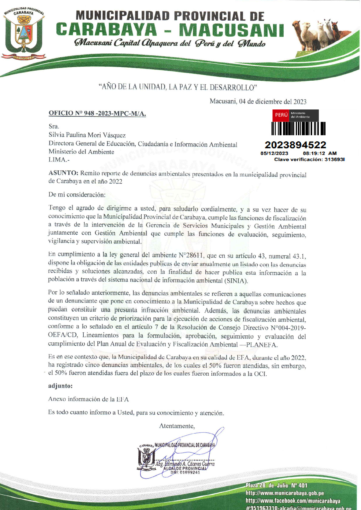 La entidad remite al Ministerio del Ambiente información sobre las denuncias ambientales en cumplimiento de lo establecido en el Decreto Legislativo N° 1055 que modifica el artículo 43° de la Ley N° 28611, que indica que "Las entidades deberán enviar anualmente un listado con las denuncias recibidas y soluciones alcanzadas, con la finalidad de hacer pública esta información a la población a través del SINIA".