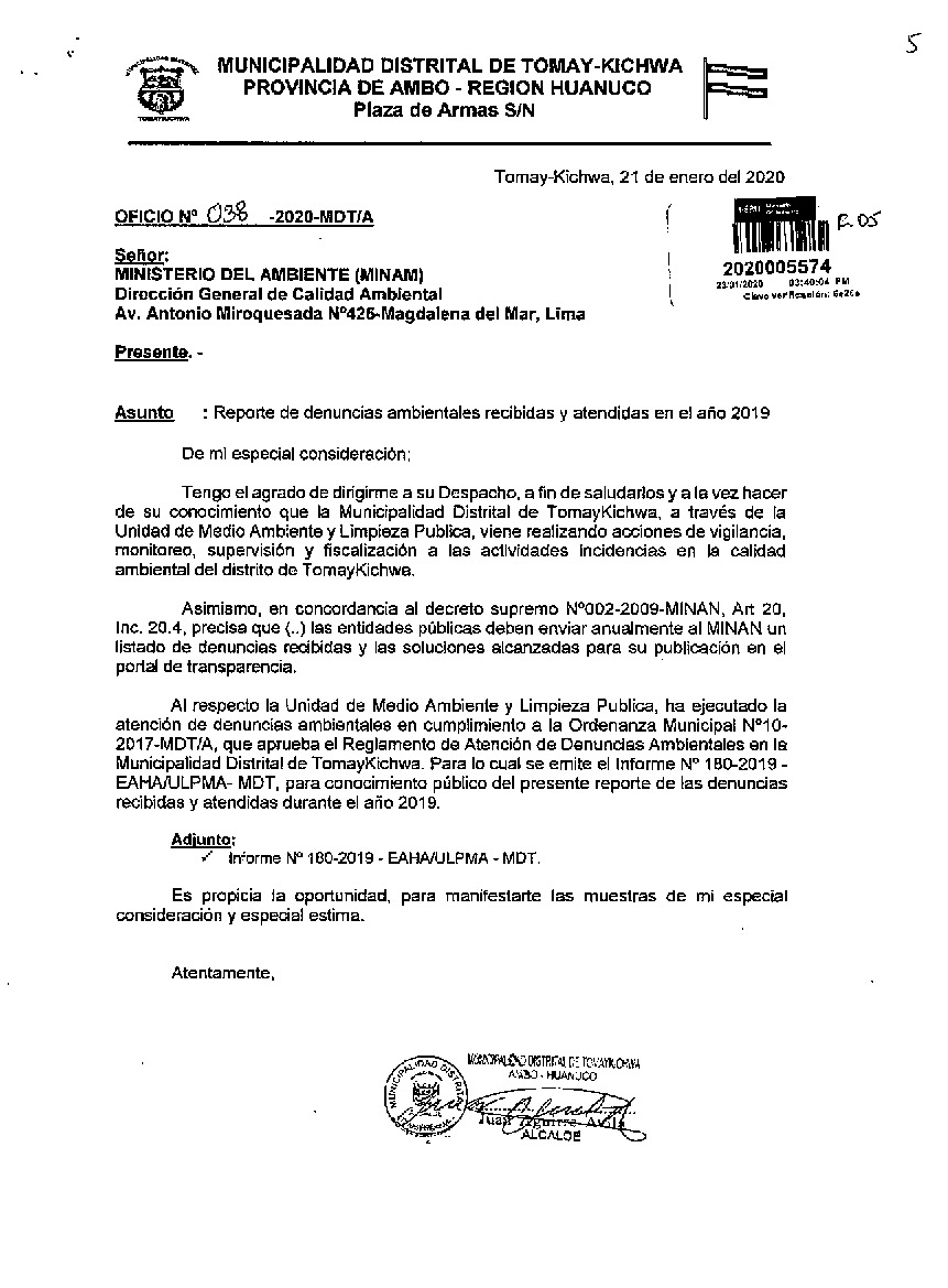 Reporte de denuncias ambientales recibidas y atendidas en el año 2019 Municipalidad Distrital Tomay - Kichwa
