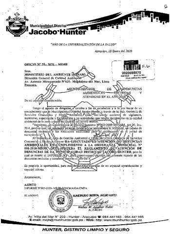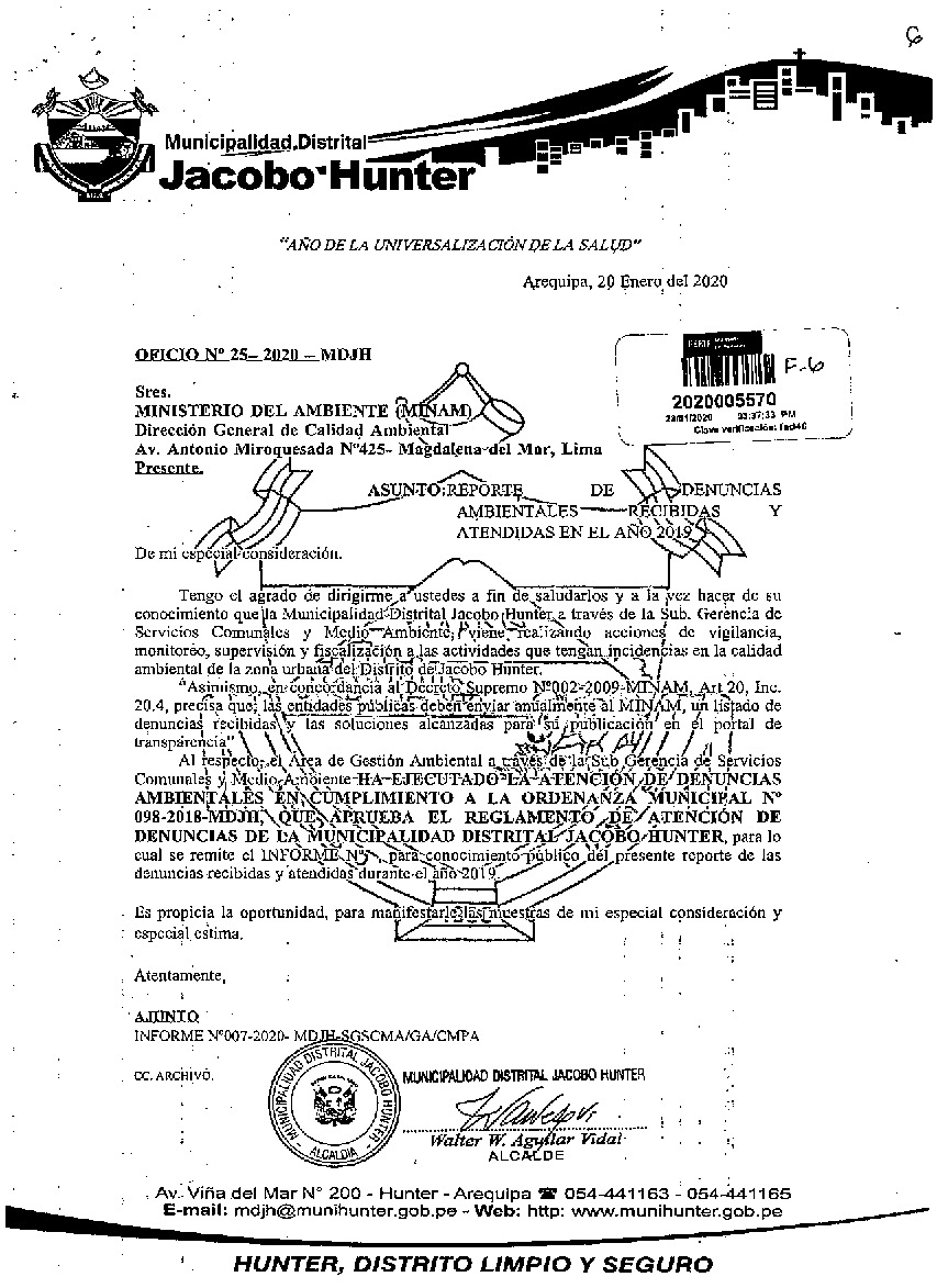 Reporte de denuncias ambientales recibidas y atendidas en el año 2019. Municipalidad Distrital Jacobo Hunter