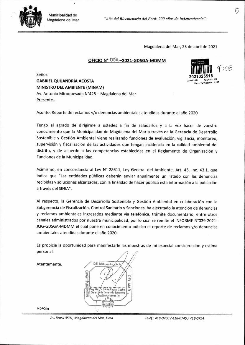 Reporte de reclamos y/o denuncias ambientales atendidas durante el año 2020 de la Municipalidad Distrital de Magdalena del Mar