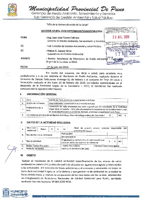 Monitoreo de Ruido Ambiental, realizado durante el Concurso de Danzas Autóctonas domingo 02 de febrero y el concurso de Traje de Luces y Veneración realizado el día lunes 10 de febrero del 2020, actividades contempladas en el desarrollo de la Festividad Virgen de la Candelaria – 2020.