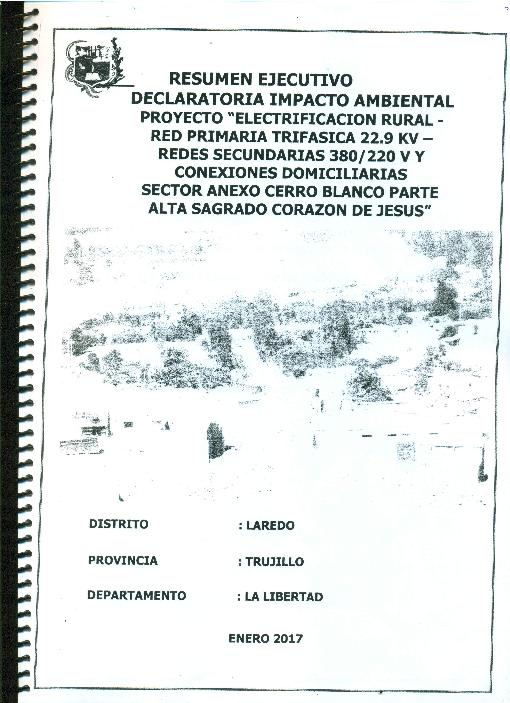Resumen Ejecutivo de la Declaración de Impacto Ambiental (DIA) del Proyecto Sistema Eléctrico Rural Red Primaria Trifásica 22.9 Kv redes secundarias 380/220V y conexiones domiciliarias, sector anexo Cerro Blanco parte Alto Sagrado Corazón de Jesús, Laredo