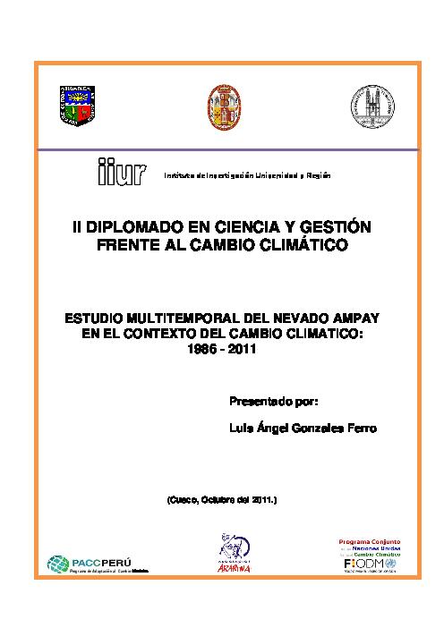 Esta monografía tiene el objetivo de calcular la superficie del retroceso glacial del nevado Ampay mediante estudios Multitemporales en el periodo 1986 a 2011 teniendo como herramienta el sensor remoto Landsat TM 5 y Landsat ETM +. Este estudio está ligado al calentamiento global que es consecuente del cambio o variabilidad climática (efecto invernadero) que viene ocurriendo a nivel mundial, el retroceso glacial en los nevados en el Perú es eminente, y el nevado Ampay no es ajeno a estos cambios, que viene retrocediendo su glacial aceleradamente en las últimas décadas. Siendo los glaciares indicadores del cambio climático, es importante el monitoreo del nevado Ampay, este estudio nos permitirá conocer el comportamiento de la superficie glacial.