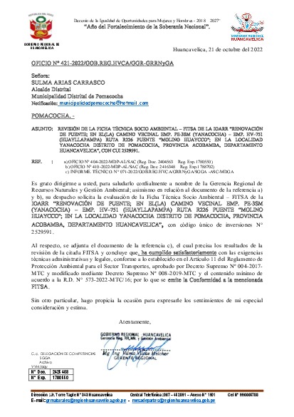 REVISIÓN DE LA FICHA TÉCNICA SOCIO AMBIENTAL – FITSA DE LA IOARR “RENOVACIÓN DE PUENTE; EN EL(LA) CAMINO VECINAL EMP. PE-3SM (YANACOCHA) – EMP. HV–751 (HUAYLLAPAMPA) RUTA R226 PUENTE “MOLINO HUAYCCO"; EN LA LOCALIDAD YANACOCHA DISTRITO DE POMACOCHA, PROVINCIA ACOBAMBA, DEPARTAMENTO HUANCAVELICA”, CON CUI 2529591.