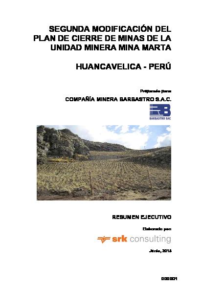 Compañía Minera Barbastro S.A.C. (en adelante “CMBSAC”) es titular de la unidad minera Mina Marta, ubicada en el distrito de Huando, provincia y departamento de Huancavelica, la cual actualmente se encuentra en cierre definitivo.SRK CONSULTING (PERU) S.A. (en adelante “SRK”) a solicitud de CMBSAC, ha elaborado la Segunda Modificación del Plan de Cierre de Minas de la unidad minera Mina Marta, conforme a lo establecido en la Ley Nº 28090, Ley de Cierre de Minas, y en concordancia al artículo 21° del Reglamento para el Cierre de Minas aprobado mediante Decreto Supremo Nº 033-2005-EM, en la cual se menciona que el titular minero podrá presentar una modificación al Plan de Cierre de Minas aprobado cuando varíen las condiciones legales, tecnológicas u operacionales que afecten las actividades de cierre de un área, labor o instalación minera, o su presupuesto. Asimismo, el informe se elaboró sobre la base del contenido recomendado en la Guía para la Elaboración de Planes de Cierre de Minas publicada en mayo de 2006 por el Ministerio de Energía y Minas (MINEM).