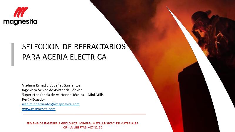 Esta presentación fue realizada por el ing. Vladimir Ernesto Cobeñas Barrientos, Ingeniero Senior de Asistencia Técnica de Refractarios Magnesita Peru SAC, el día miércoles 07 de Diciembre en el auditorio del Colegio de Ingenieros de La Libertad.