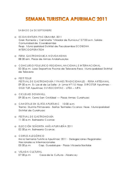 Contiene informacion de las actividades que se desarrollaron durante la semana turistica de Apurimac 2011