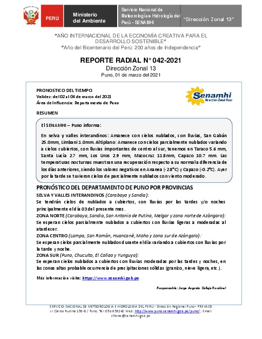 SENAMHI-DZ13 Puno: Reporte radial de 01 de marzo del 2021