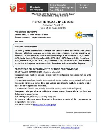 SENAMHI-DZ13 Puno: Reporte radial del 01 de marzo del 2023