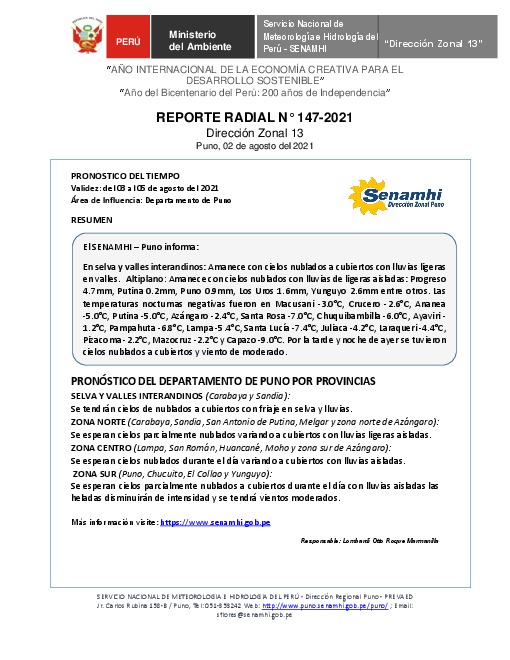 SENAMHI-DZ13 Puno: Reporte radial del 02 de agosto del 2021