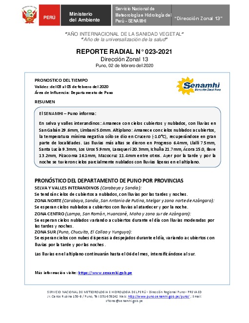 SENAMHI-DZ13 Puno: Reporte radial de 02 de febrero del 2021