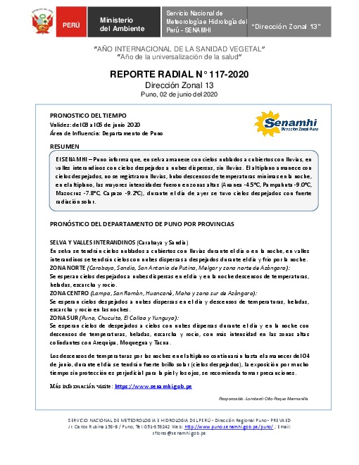 SENAMHI-DZ13 Puno: Reporte radial de 02 de junio del 2020