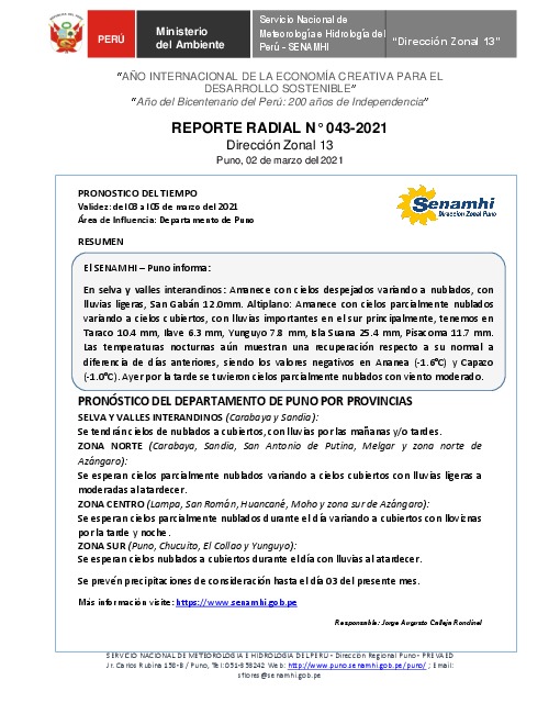 SENAMHI-DZ13 Puno: Reporte radial de 02 de marzo del 2021