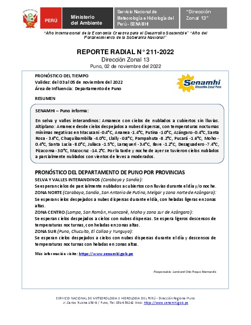 SENAMHI-DZ13 Puno: Reporte radial del 02 de noviembre del 2022